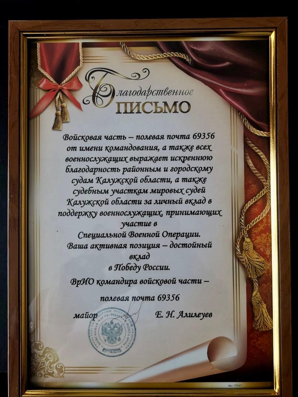 Судьи и сотрудники районных (городского) судов Калужской области и судебных участков мировых судей Калужской области приняли участие в благотворительной акции по сбору гуманитарной помощи для военнослужащих, находящихся в зоне специальной военной операции. На средства, собранные судами, были приобретены генераторы, горюче-смазочные материалы, инструменты и другие необходимые вещи. Гуманитарный груз был успешно доставлен в одно из подразделений Вооруженных Сил Российской Федерации, командование которого выразило благодарность судам Калужской области за помощь и поддержку. |